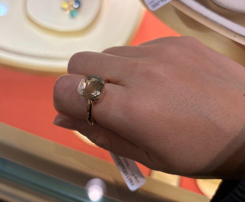 ヌードはポメラートの中でも代表的存在ですが、丸みのあるカットのストーンが指の上にちょこんと乗るようなデザインで、シンプルなのに唯一無二の存在感があって本当に素敵です。